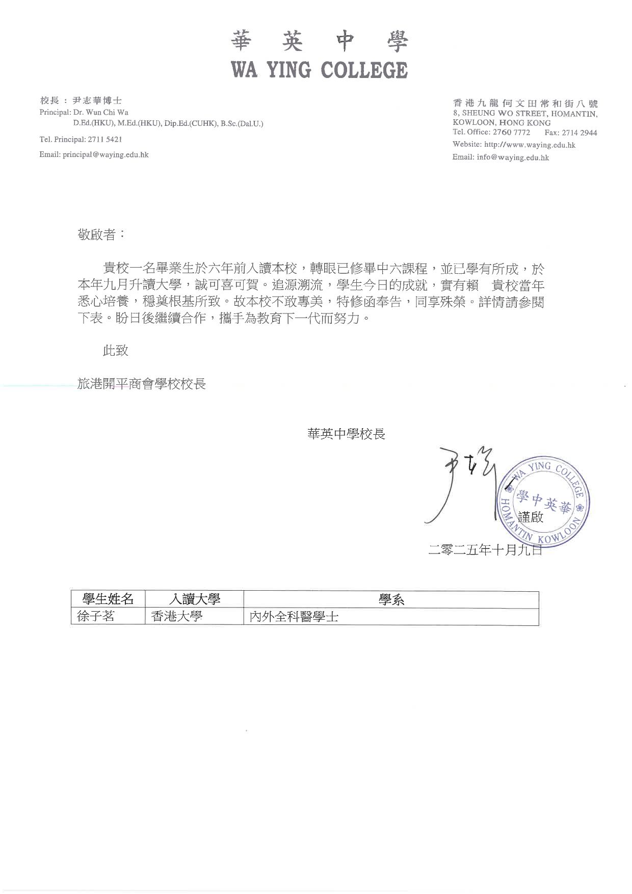 恭賀本校校友徐子茗同學於本年度香港中學文憑試中表現卓越,榮獲香港大學醫學院取錄,將入讀內外全科醫學士課程,實屬可喜可賀,足為同學楷模。